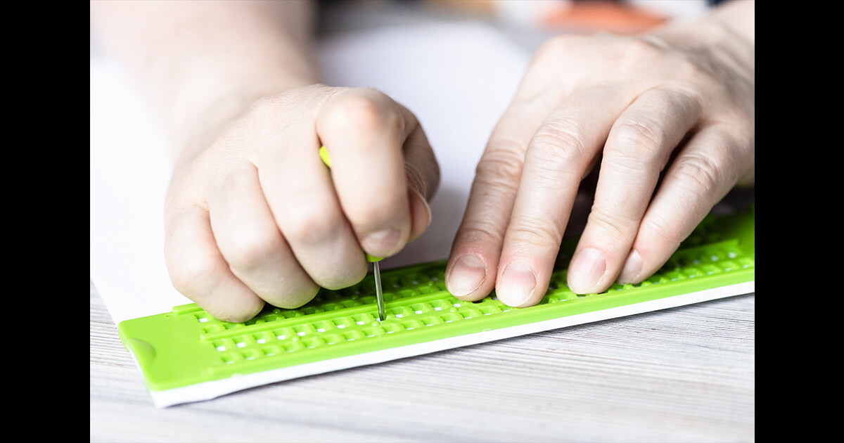 点字を刻印するにあたって、視覚障がい者が1枚1枚手作業にて刻印しております。